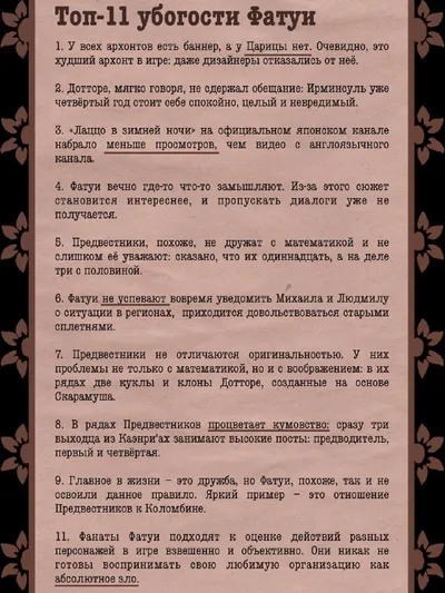 🕊️ Как известно, наш канал создан с целью буллинга и насмешек над Фатуи и Снежной. И читатели давно просили сделать памятку, на которую можно ссылаться в жарких спорах с фатуифанами. Что ж, представл