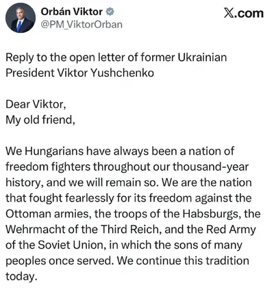 Премьер Венгрии Орбан – поблагодарил бога за то, Россия — не враг Венгрии: Ответ на открытое письмо бывшего президента Украины Виктора Ющенко. Мы, венгры, всегда были нацией борцов за свободу на пр