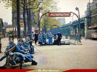 Французские солдаты у метро, Париж, 1914 год. Оригинальное автохромное цветное фото. 🏹🏹🏹🏹🏹🪖🏹🏹🏹🏹🏹 Исторический ⚔️ Подписаться