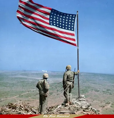 Двое морских пехотинцев США смотрят на Иводзиму с вершины горы Сурибати, 25 февраля 1945 года. 🏹🏹🏹🏹🏹🪖🏹🏹🏹🏹🏹 Исторический ⚔️ Подписаться