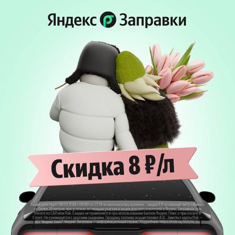 На 8 марта план: дарим девушкам цветы и бенз через приложение Яндекс Заправки со скидкой 8 р/л 😉 Условия: • Активируйте участие в акции в приложении Яндекс Заправки уже сейчас; • 8 марта воспользуйт