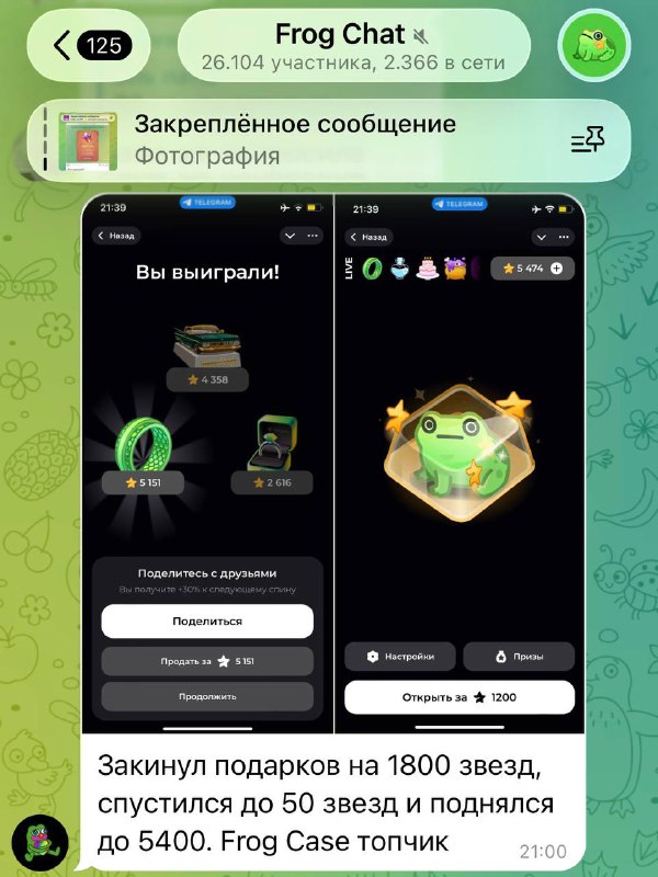 🤑 Кто хочет такие же крутые подарки и звезды? Открывайте платные кейсы в Frog 👇 🐸 Играть в @FrogCaseBot 💳 Пополнить баланс рублями