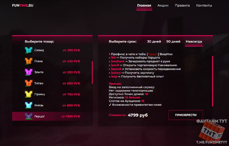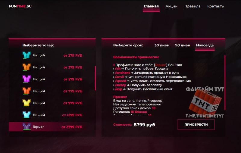 ЮБИЛЕЙНЫЕ СКИДКИ НА ДОНАТ 🖥 В честь 10-летия ФанТайма на сайте сервера обновили цены на привилегии - сейчас действуют праздничные скидки на все любимые товары Новые цены: 🥇 Герцог — 4 799₽ (было 1