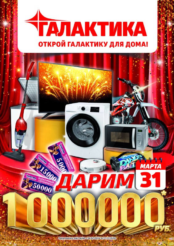 🎉✨ Акция "Дарим 1 000 000 руб" в ТЦ "Галактика"! ✨🎉 С 06 февраля по 31 марта 2026 года стартует акция, в рамках которой мы дарим 1 000 000 рублей! 🔥 🌟 Как участвовать? 1. Для участия в Акции