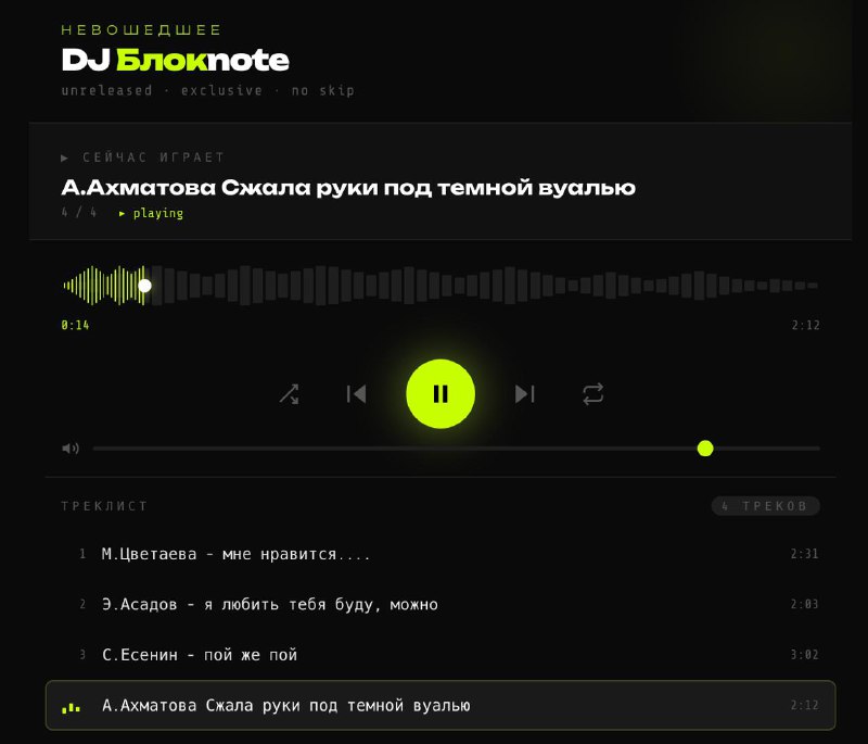 Новая невошедшая песня уже на сайте https://djbloknote.ru/ Я думаю, вам понравится жуткое, но танцевальное настроение музыки 🙏