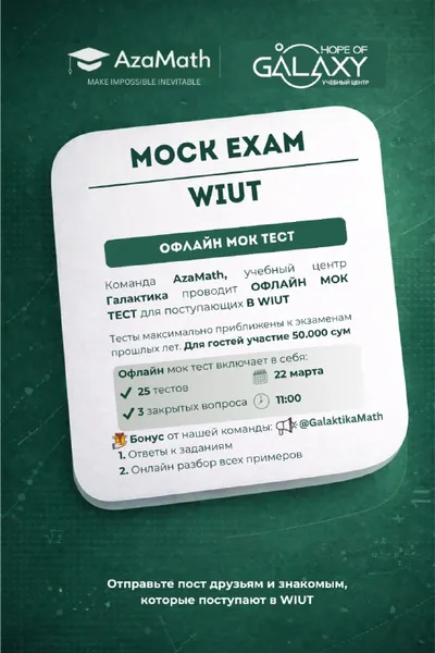 Бесплатный мок тест для поступающих в WIUT от команды AzaMath Наша цель помочь ученикам достигнуть своих целей! Копировать наши задания или использовать их для своих целей строго запрещается! Всем м