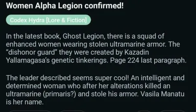 Слух, что в последней грядущей книге Ghost Legion про Альфа Легион будет отряд "усиленных женщин", которые носят украденную броню Ультрамаринов. К их созданию имеет отношение Казадин Йалламагаса и его