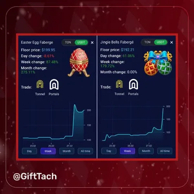 ☝️ Faberge резко запампили 🥚 Faberge egg ~199$ (+275% за месяц) 🎁 Jingle Bells Faber ~192$ (+180% за месяц) @Gifttach • GiftTop