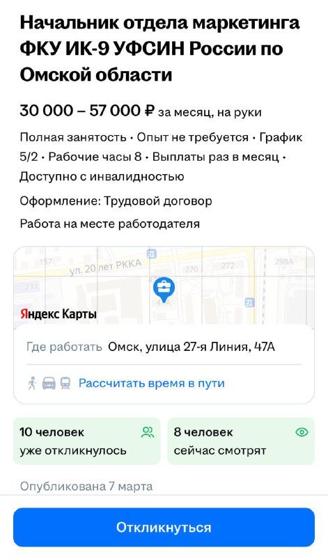 Омская колония строгого режима ищет начальника отдела маркетинга. Зарплата — до 57 000₽. Ключевые навыки, которыми должен обладать кандидат: продвижение бренда, маркетинговые исследования, организат