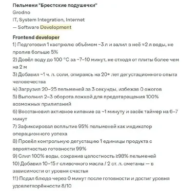 Айтишник написал в резюме рецепт приготовления пельменей, и его пригласили на собеседование. Дело в том, что парень идеально оформил резюме так, что ИИ-эйчар не смог найти подвох. Нейросеть посчитала