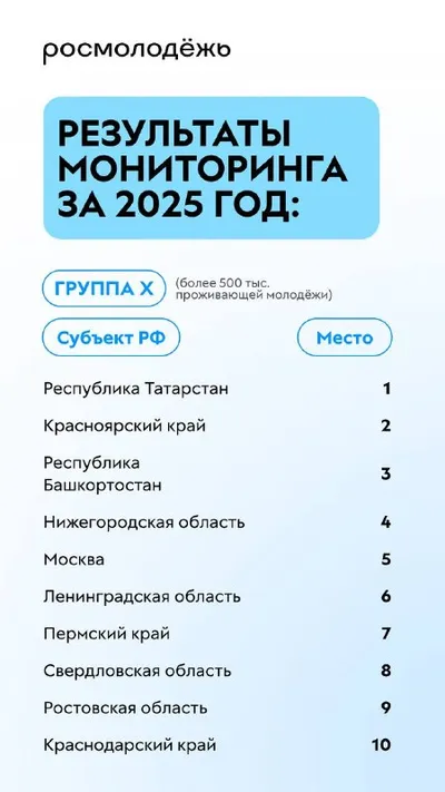 Традиционно подводим итоги главного измерения в сфере молодёжной политики — ежегодного мониторинга эффективности среди регионов России. Поздравляю субъекты, которые вошли в десятку лучших. Так держат