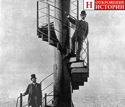 Французский инженер Александр Эйфель (слева) позирует высоко на ступенях недавно достроенной Эйфелевой башни, 1889 год. ✍️ Откровение Истории