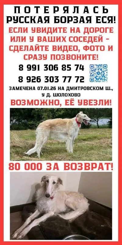 Бежево-белую борзую видели 17.03. 26 в 14.50 одиноко бегущей в городе Железнодорожный, в красном ошейнике, собака грязная. По фото опознали Есю. Нужна помощь в поиске, оклейка на месте сигнала!‼️ По