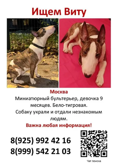 Москва, МО Возможно собака в Мытищах Ищу собаку, порода мини-бультерьер. 24.03.2026 моя бабушка,отдала собаку неизвестному человеку с документами ,пока меня не было дома,я была на работе. Я очень на