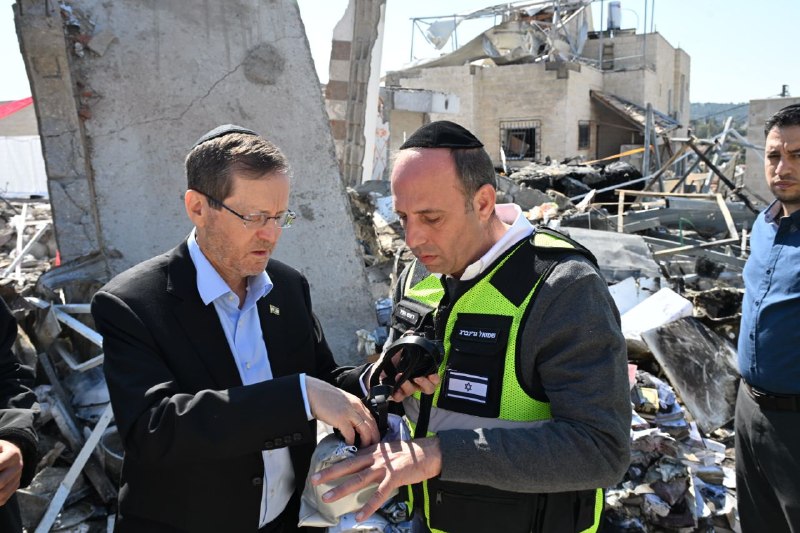 Президент Израиля Ицхак Герцог на месте прямого попадания иранской ракеты в городе Бейт-Шемеш: «Мы находимся здесь, на месте разрушений и ужаса. Это одна из первых синагог в Бейт-Шемеше. Прямое попа
