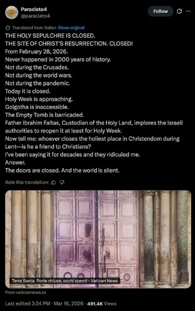 Израиль закрывает Храм Гроба Господня впервые в истории христианства. Этого никогда не происходило даже за 1200 лет мусульманского правления.