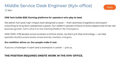 GR8 Tech ищет сотрудников в киевский офис. GR8 Tech — это бывшее технологическое подразделение подсанкционного казино Parimatch Tech, переименованного после введения санкций СНБО. Parimatch продолжает