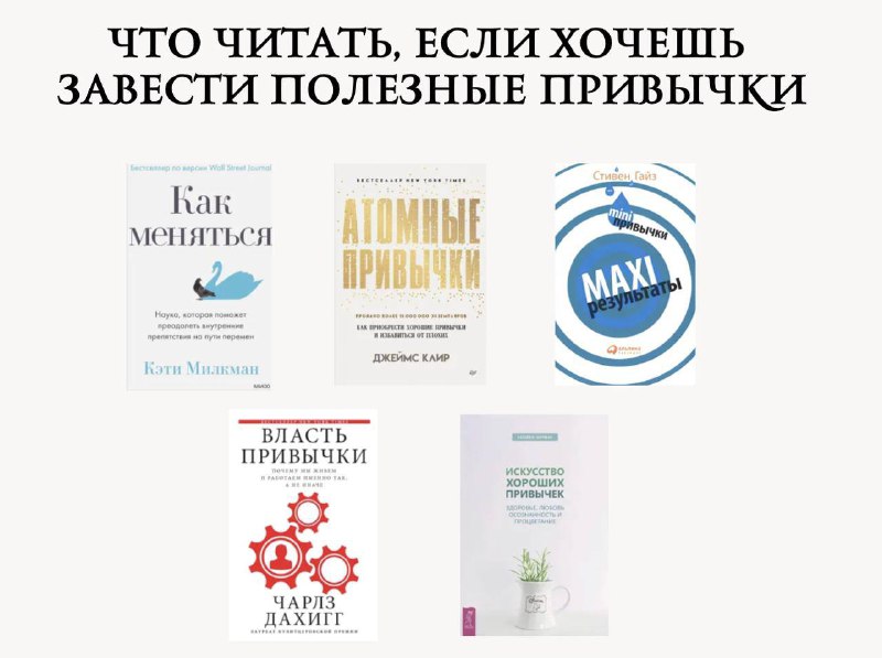 Топ-5 книг для развития полезных привычек 1. «Как меняться» Кэти Милкман 2. «Атомные привычки» Джеймс Клир 3. «MINI-привычки — MAXI-результаты» Стивен Гайз 4. «Власть привычки» Чарлз Дахигг 5. «Иску