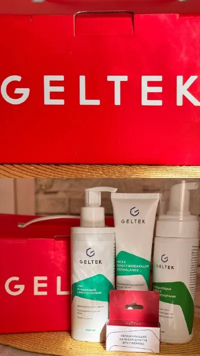 Недавно попробовала Гельтек, и неожиданно зашло ❣️ Сейчас у меня: • гель с PHA-кислотами — мягко очищает, без сухости • пенка с AHA — кожа после гладкая и свежая • поросуживающая маска — быстро приво