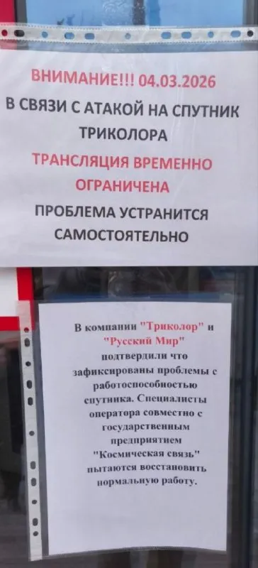 ВНИМАНИЕ!!! 04.03.2026 В СВЯЗИ С АТАКОЙ НА СПУТНИК ТРИКОЛОРА ТРАНСЛЯЦИЯ ВРЕМЕННО ОГРАНИЧЕНА ПРОБЛЕМА УСТРАНИТСЯ САМОСТОЯТЕЛЬНО. В компании "Триколор" и "Русский Мир" подтвердили что зафиксированы п