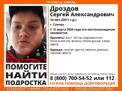Внимание! Помогите найти подростка! Пропал #Дроздов Сергей Александрович, 14 лет, г. #Самара С 12 марта 2026 года его местонахождение неизвестно. Инфорги поиска: Ася 89277518770. Тема на форуме: ht