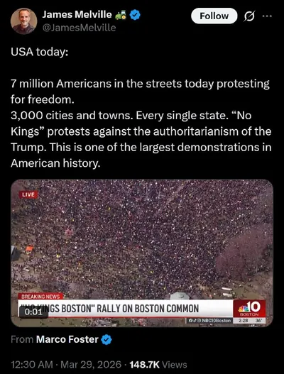 🐦 В США прошли массовые протесты против Трампа На улицы вышли около 7 млн человек в более чем 3,000 городах и населённых пунктах, во всех штатах. Протесты проходили под лозунгом “No Kings” - против