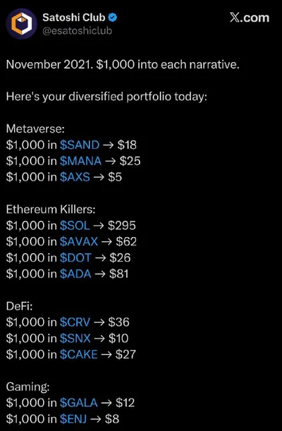 🐦 Ноябрь 2021. По $1,000 в каждый нарратив. Вот как выглядит твой диверсифицированный портфель сегодня: Metaverse: $SAND → $18 $MANA → $25 $AXS → $5 Убийцы Ethereum: $SOL → $295 $AVAX → $62 $DOT →