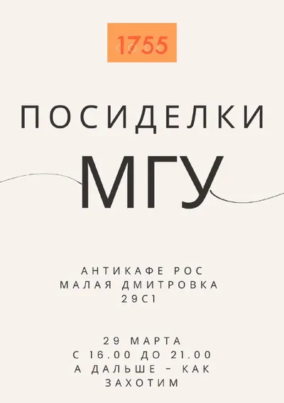 через 8 дней — #посиделки_мгу 🫶🏼 собираемся нашей компанией мгушников и их друзей, чтобы много смеяться, знакомиться и прожить вместе ещё один хороший вечер. будем играть в мафию, тайного гитлера,