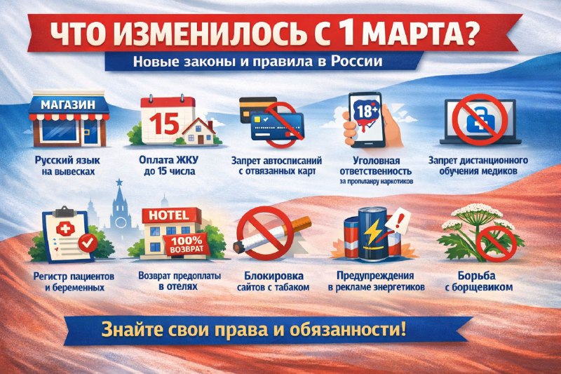 📌 Что изменилось в России с 1 марта: основные нововведения 🇷🇺 Русский язык — обязателен для бизнеса Теперь на всех вывесках, указателях, меню и рекламных конструкциях необходимо использовать рус