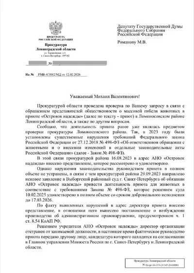 ❗️ По итогам рассмотрения моего депутатского запроса в адрес Генерального прокурора РФ Александра Гуцана по факту массовой гибели животных в приюте «Островок надежды» в Ломоносовском районе Ленинградс