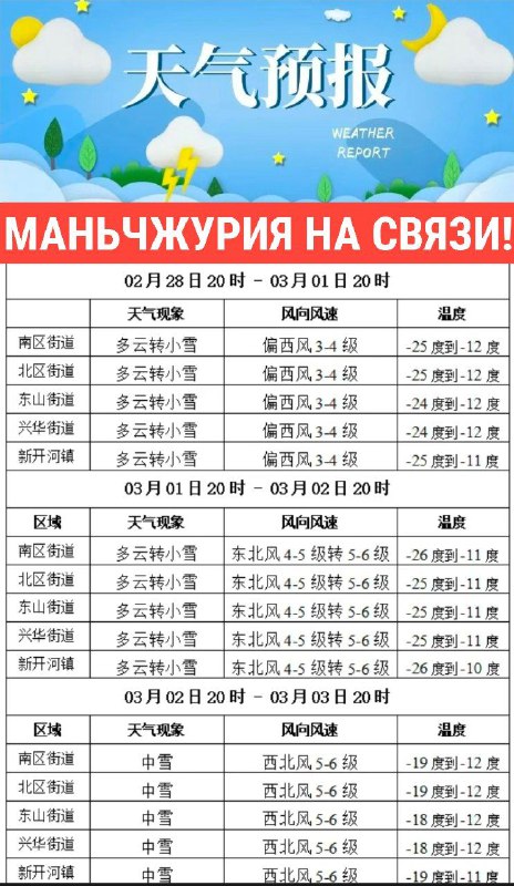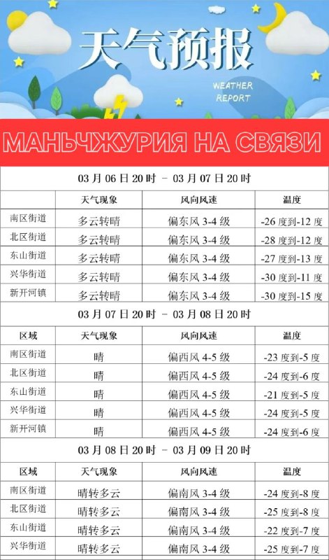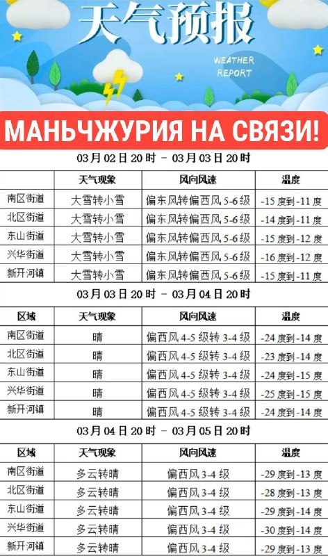 Погода в Маньчжурии на ближайшие три дня. 7-9 марта. Сейчас в Маньчжурии -30°, ветер 3-4 м.сек. Очень холодно. Завтра днём потепление до -6°, ночью до -24°, усиление ветра до 5-6 м/сек