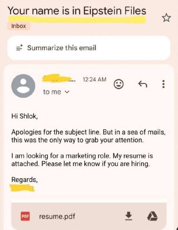 Ваше имя в файлах Эпштейна Именно так соискатель начал письмо к CEO с просьбой взять его на должность маркетолога. Тема сработала: шеф открыл меил и прочитал, а скрин облетел весь LinkedIn. Да, рыно