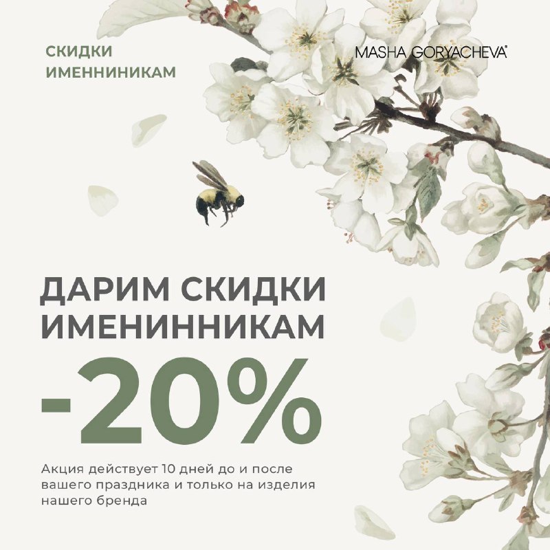 День рождения в марте?💕 Дарим вам скидку -20% на покупку изделий нашего бренда!* Акция действует за 10 дней до и 10 дней после вашего праздника. Приятных покупок!🌸 *акция не суммируется с другими