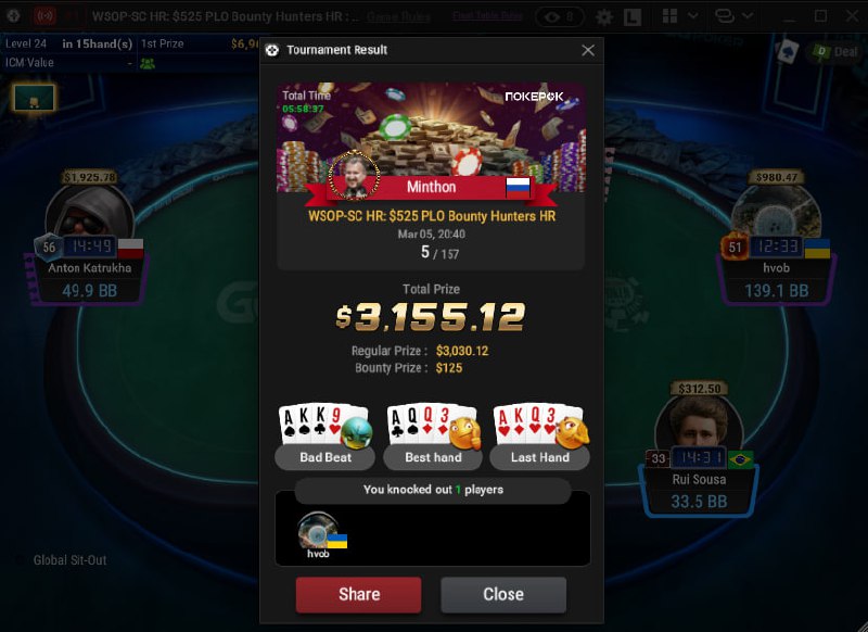 Сессия супер по пивному начиналась, столы закрывались со скоростью света 6-бет пуш поставил с А7о зачемто (на тузов обв посмотрел) Но омашка широкой грудью заступилась)) Чуть нанокал, чуть на финалке