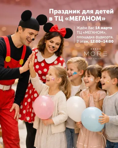 Праздник для детей в ТЦ «МЕГАНОМ» Завтра, 14 марта, команда MORE SPA & RESORT приглашает маленьких гостей и их родителей провести тёплый и весёлый день вместе. С 12:00 до 14:00 на площадке будет раб