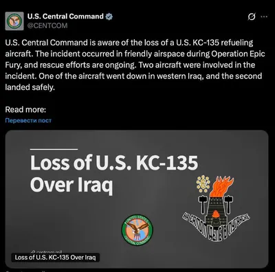 ❌Американский самолёт-заправщик KC-135 потерпел крушение в Ираке. Об этом сообщило Центральное командование США. На борту находилось 6 человек. В инциденте участвовали два самолёта. Один из них упал