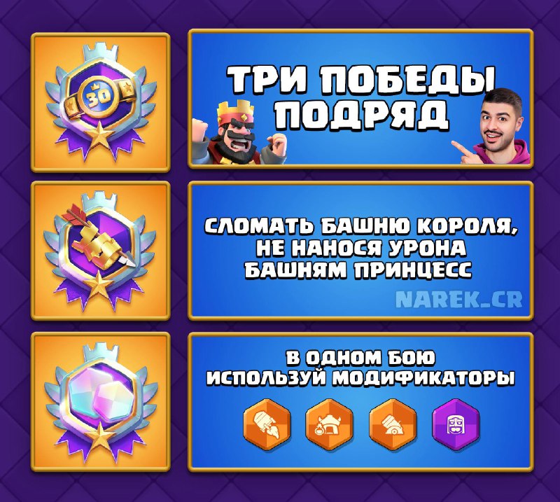 1️⃣ 3 Победы в ХАОС ПОДРЯД 2️⃣ Уничтожить БАШНЮ 🤴, не затрагивая башню 🪵 (0 урона) 3️⃣ Необходимо создать колоду с картами 🐩 🍎 🦖 🐪 и в ОДНОМ БОЮ словить все Модификаторы из картинки выше👆(поб