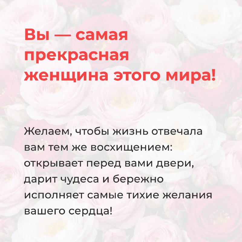 Дорогие дамы, к 8 марта мы нежно вырастили для вас целый сад цветов и собрали из него букеты поздравлений. Каждый букет хранит своё послание — тёплое, поддерживающее, вдохновляющее. Посмотрите на цве