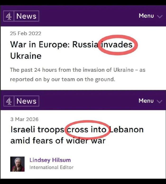 Двойные стандарты «демократической» и «неполживой» западной прессы. Первый заголовок: Россия «вторгается» в Украину. Второй заголовок: Израильские войска «пересекают границу» с Ливаном на фоне опасе