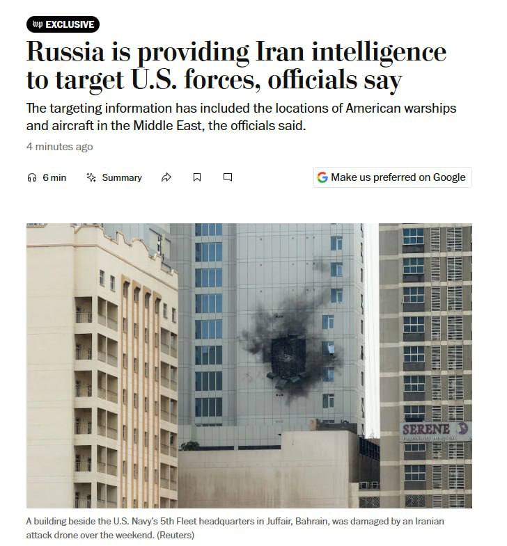 ‼️Американские официальные лица заявляют, что Россия предоставляет Ирану разведданные о местонахождении американских военных кораблей и самолётов на Ближнем Востоке, помогая Тегерану наносить удары по