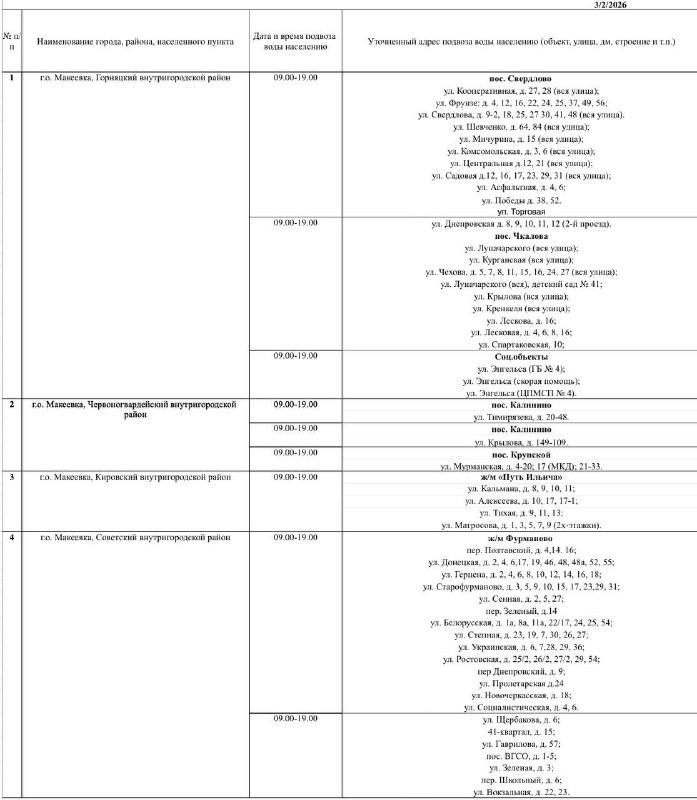 📍 График подвоза воды населению городского округа Макеевка 💧 Завтра, 2 марта, в Макеевке будет организован подвоз воды для жителей, в дома которых не поступила вода в установленный графиком день.