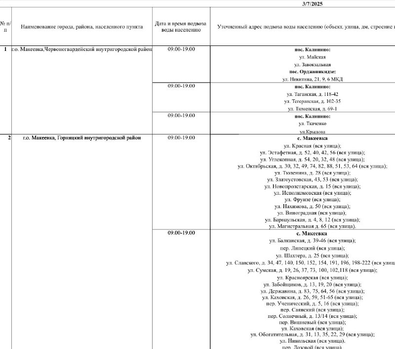 📍 График подвоза воды населению городского округа Макеевка 💧 Завтра, 7 марта, в Макеевке будет организован подвоз воды для жителей, в дома которых не поступила вода в установленный графиком день.