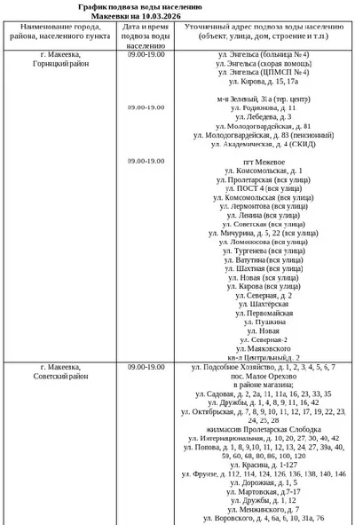 📍 График подвоза воды населению городского округа Макеевка 💧 Сегодня, 10 марта, в Макеевке будет организован подвоз воды для жителей, в дома которых не поступила вода в установленный графиком день.
