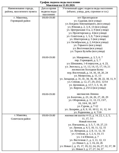 📍 График подвоза воды населению городского округа Макеевка 💧 Завтра, 11 марта, в Макеевке будет организован подвоз воды для жителей, в дома которых не поступила вода в установленный графиком день.