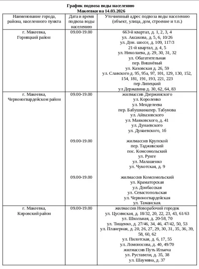 📍 График подвоза воды населению городского округа Макеевка 💧 Завтра, 14 марта, в Макеевке будет организован подвоз воды для жителей, в дома которых не поступила вода в установленный графиком день.