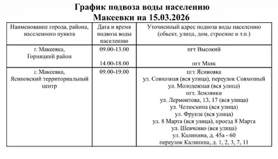 📍 График подвоза воды населению городского округа Макеевка 💧 Завтра, 15 марта, в Макеевке будет организован подвоз воды для жителей, в дома которых не поступила вода в установленный графиком день.