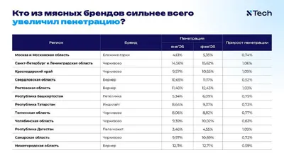 🥩 Как мясопереработчики прошли начало года? Мы посчитали изменение пенетрации* крупнейших мясных брендов по крупнейшим регионам РФ (фев’26 к янв’26). В таблице выше отражены бренды, которые больше