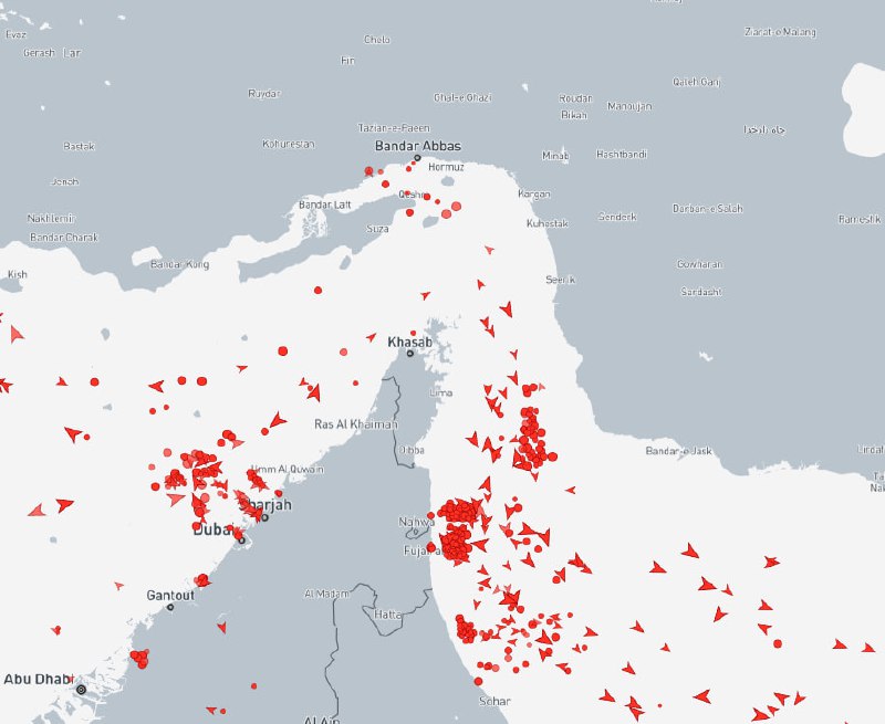 В Ормузском проливе сейчас так. Все отмеченные суда — танкеры.