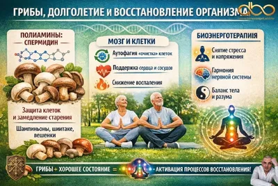 🍄 ГРИБЫ, ДОЛГОЛЕТИЕ И ВОССТАНОВЛЕНИЕ ОРГАНИЗМА Грибы — это не просто еда. Это продукт, который влияет на глубинные процессы в организме: восстановление клеток, работу сердца, мозга и общее состояние