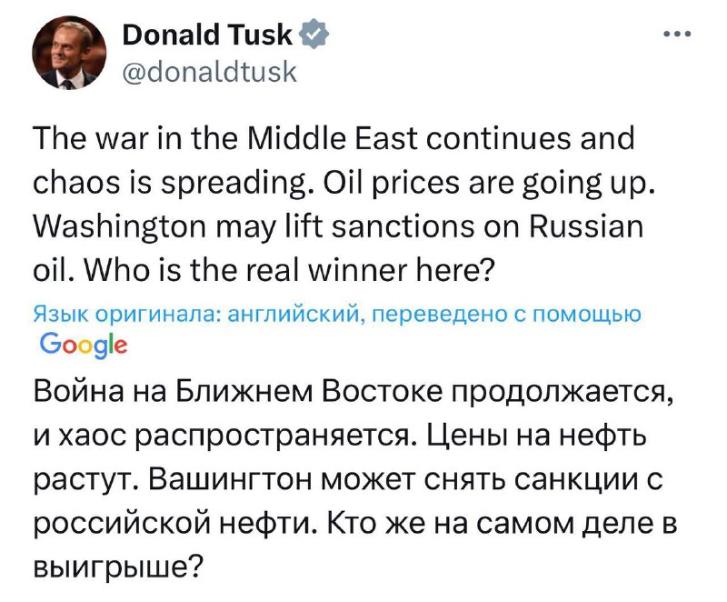 "Кто в реальности выигрывает от конфликта на Ближнем Востоке?", – задался вопросом премьер Польши Туск. "Цены на нефть растут. Вашингтон может снять санкции с российской нефти", — написал он в соцсе